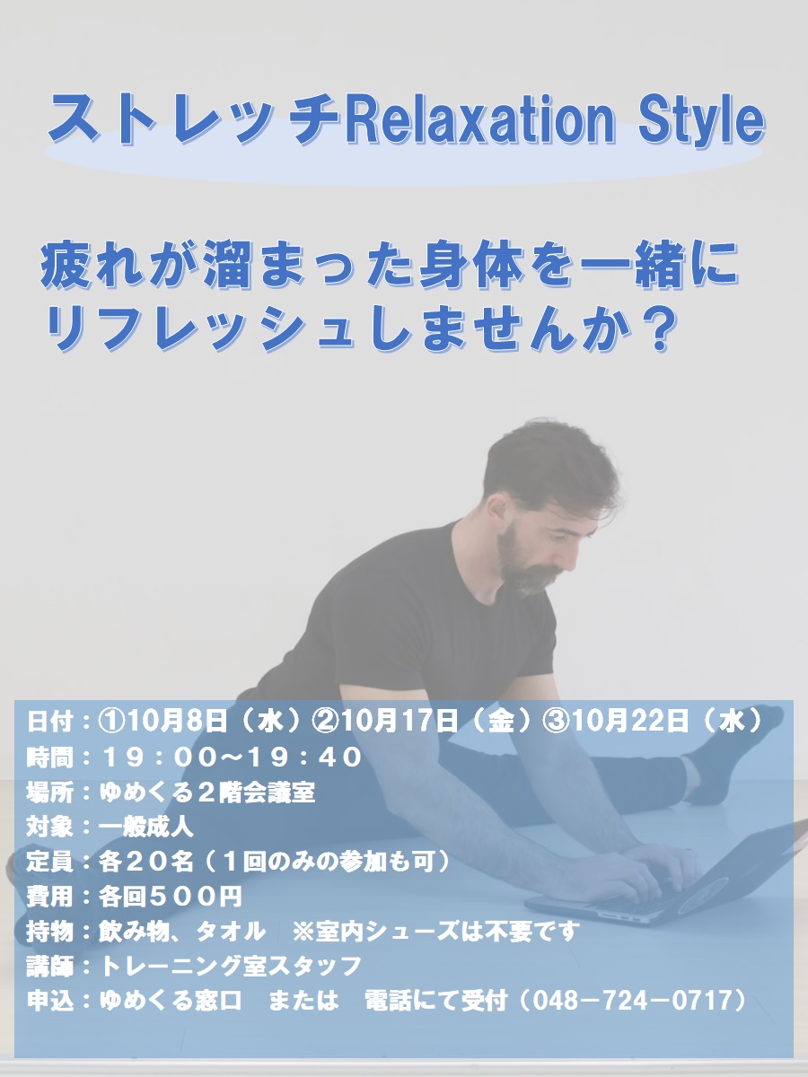 | 内容 | リラックスした状態で全身のストレッチを行います!ストレッチには筋肉の疲労軽減や関節可動域が広がるなど様々な効果が期待できます! 身体の疲れが溜まっている方や関節の動きが悪いと感じる方、是非ご参加ください! <運動強度:弱> ※1回のみの参加も可。 |