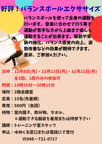 | 内容 | バランスボールを使って、全身の運動を行います。音楽に合わせて行うことで、運動が苦手な方から上級者まで楽しく運動することができ、腹筋や背筋の強化、バランス感覚の向上、姿勢改善などの効果が期待できます。一人だとトレーニングが続かない方、たくさん運動をして汗をかきたい方、一緒にトレーニングをしてみませんか!! <運動強度:弱~中> ※1回のみの参加も可 |